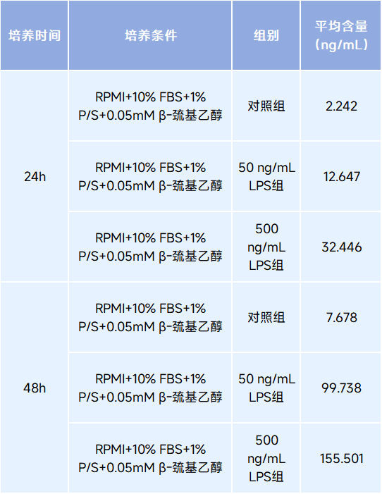 人單核細(xì)胞白血病細(xì)胞(THP-1)分別添加了終濃度為50 ng/mL、500 ng/mL的LPS刺激劑,在含有10%胎牛血清的RPMI-1640培養(yǎng)基中培養(yǎng)24小時(shí)和48小時(shí),測(cè)量上清中Human CXCL10的含量變化。