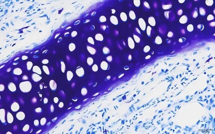 軟骨基質(zhì)中的硫酸軟骨素、硫酸角質(zhì)素為異色性物質(zhì),含有酸性硫酸根,而酸性硫酸根與嗜堿性染料有親和力,遇到甲-苯胺藍可呈異染性紫紅色。